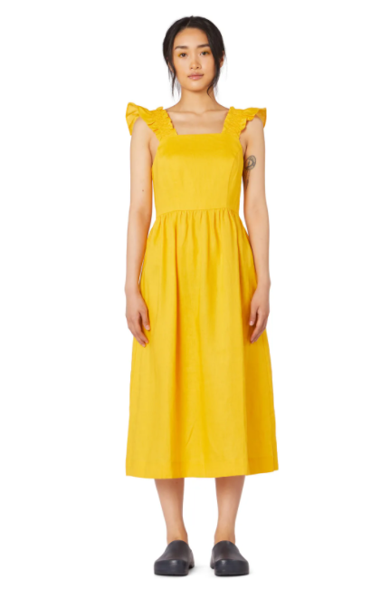 Gorman's linen shirred dress is stunning. It is made of natural linen. a straight neckline, it is lightweight and breathable. Slight gathering at the waistline; mid-length; below knee; ruched sleeves; and side seam pockets complete the look. To complete the look, wear it with a pair of mules or a pair of dangling earrings. Click here to get your hand on Gorman’s Linen Shirred Dress.