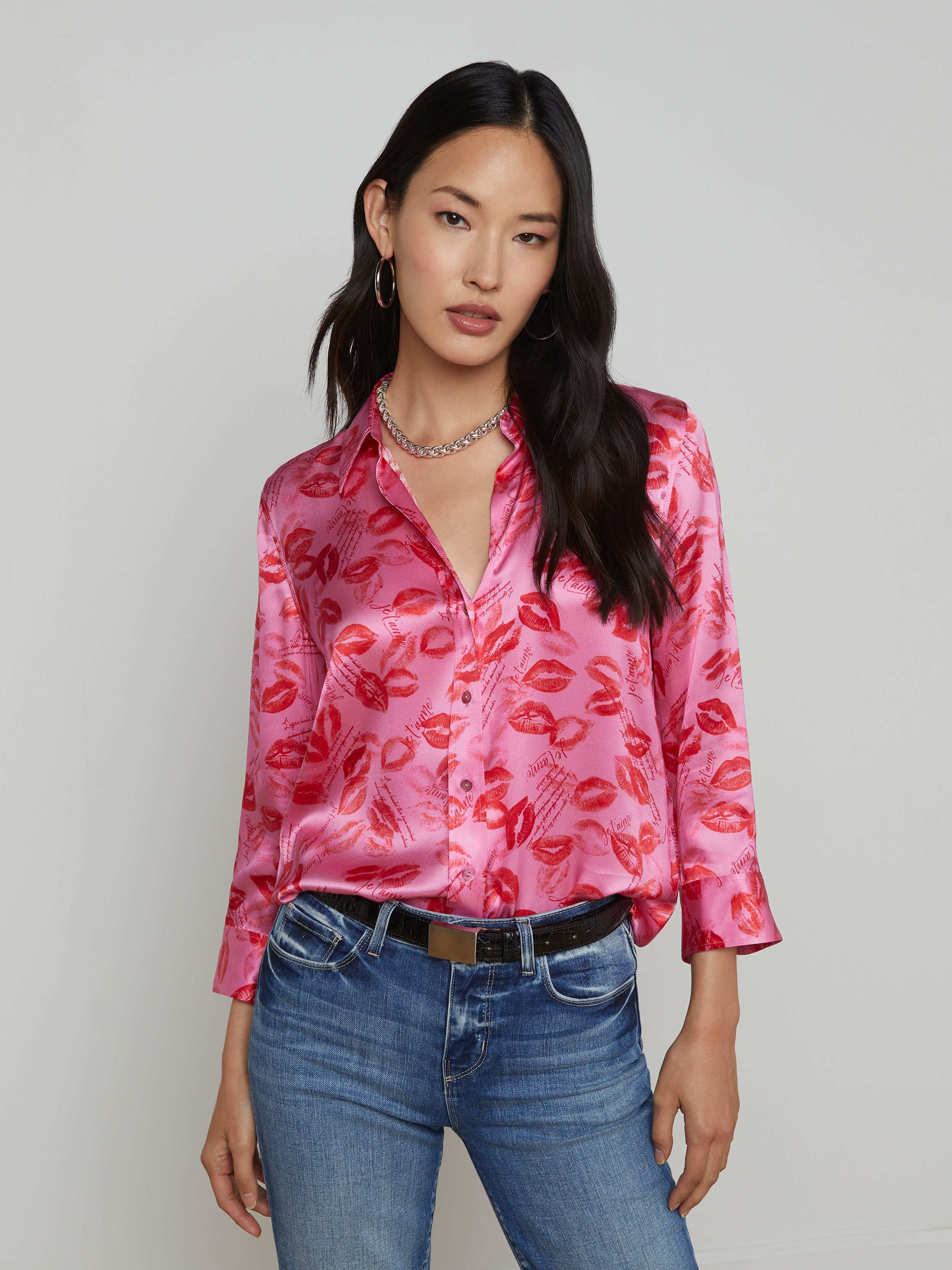 This iconic silk button-down is a must-have in every wardrobe. Featuring a romantic lipstick print with French love notes, it combines style and charm. Made from 100% silk charmeuse, the slim fit and 3/4 sleeves create a flattering silhouette. The high-low shirttail hem and front button closure add versatility.