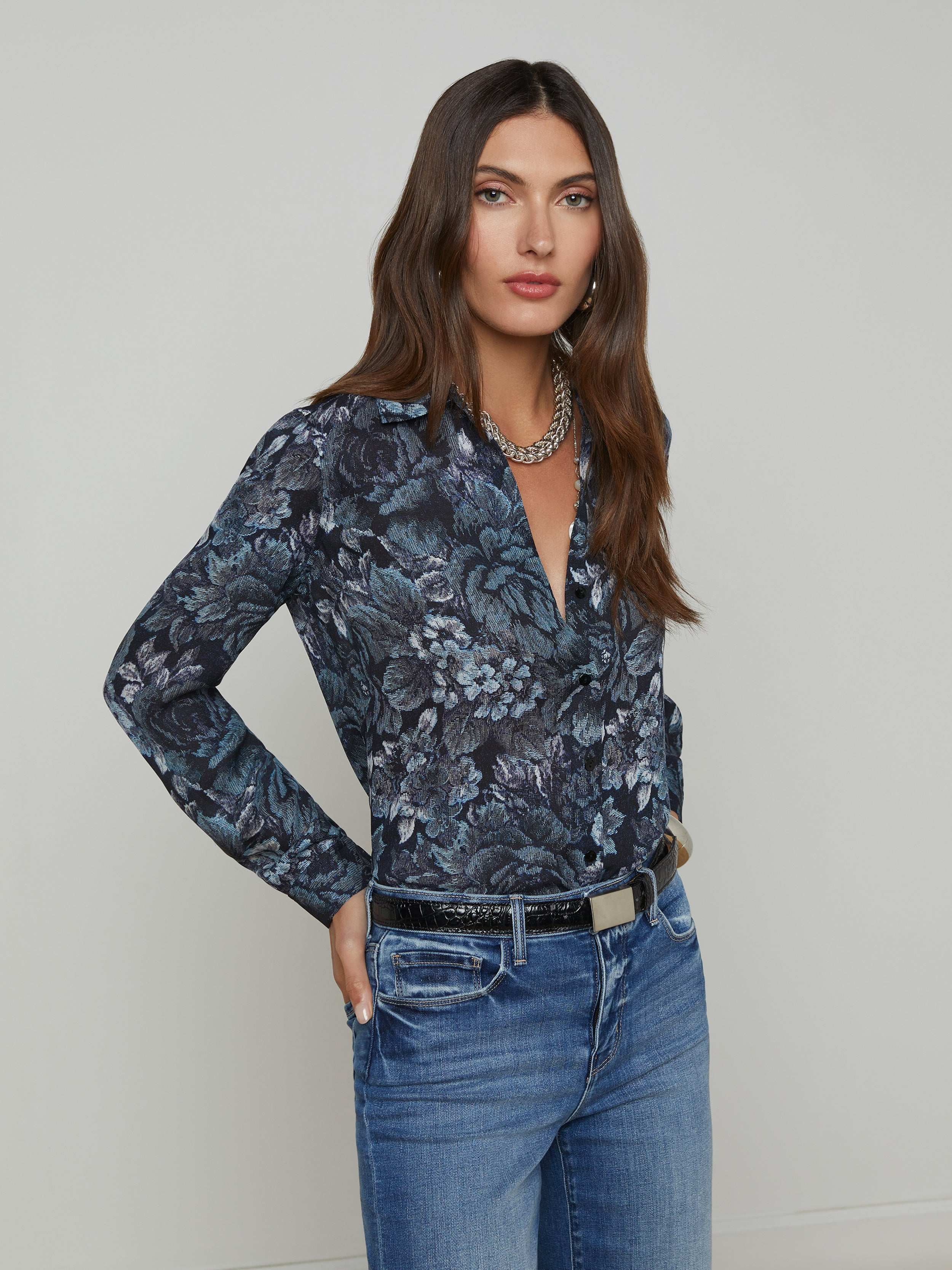 The Nina silk button-down returns in a relaxed fit, now featuring a tapestry-inspired floral print. Crafted from 100% silk, it boasts long sleeves, a flattering high-low shirttail hem, and a front button closure. This versatile piece offers a perfect blend of elegance and comfort for any occasion.